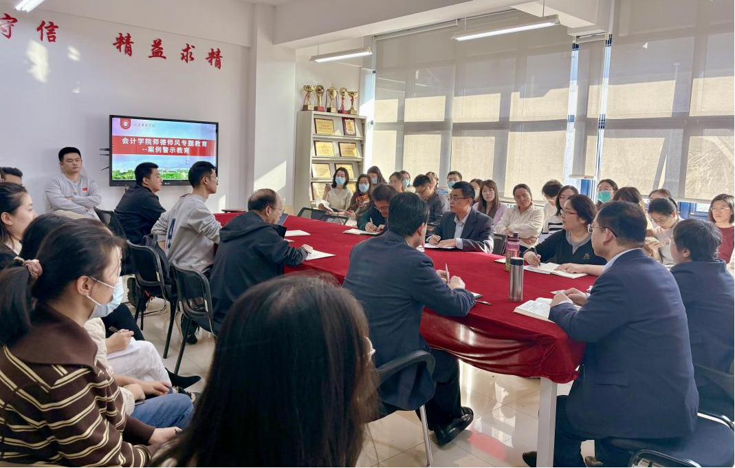 为全面贯彻党的教育方针,落实立德树人根本任务,进一步加强教师队伍建设,提升教师职业道德素养,11月19日,会计学院在明德楼411召开了师德师风专题教育会议。学院领导及全体教师参加了会议。