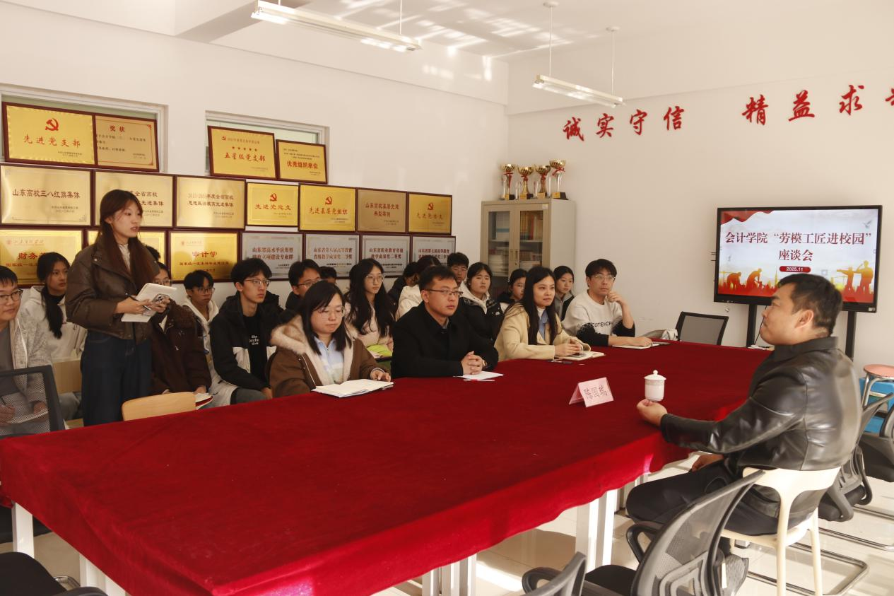 为大力弘扬劳模精神、劳动精神、工匠精神,引导学生树立正确的劳动观和职业观,2025年11月26日上午,会计学院举办“劳模工匠进校园”报告会。活动特邀济南市城肥清运服务中心班长、济南市商河县孙集镇杨八士村第一书记陈国瑞作专题报告。会计学院党委副书记刘树松、团总支书记李彬彬、辅导员及学生代表共同参加了此次活动。会议由李彬彬主持。