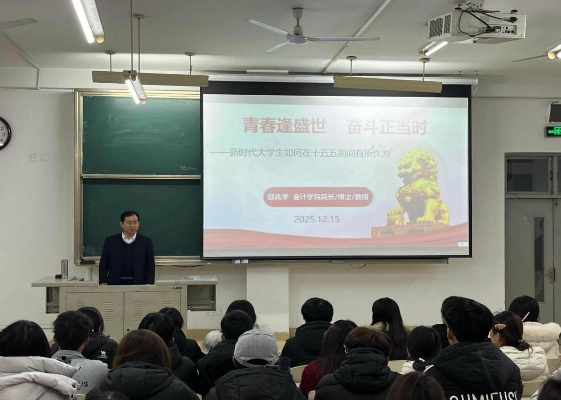 为深入贯彻落实党的二十届四中全会精神,精准对接“十五五”规划发展要求,引领会计学院学子明确奋斗方向、强化使命担当,12月15日,会计学院院长邱兆学以《新时代大学生如何在十五五期间有所作为》为题,为会计学院60余名同学带来了一堂内涵深刻的思政课。