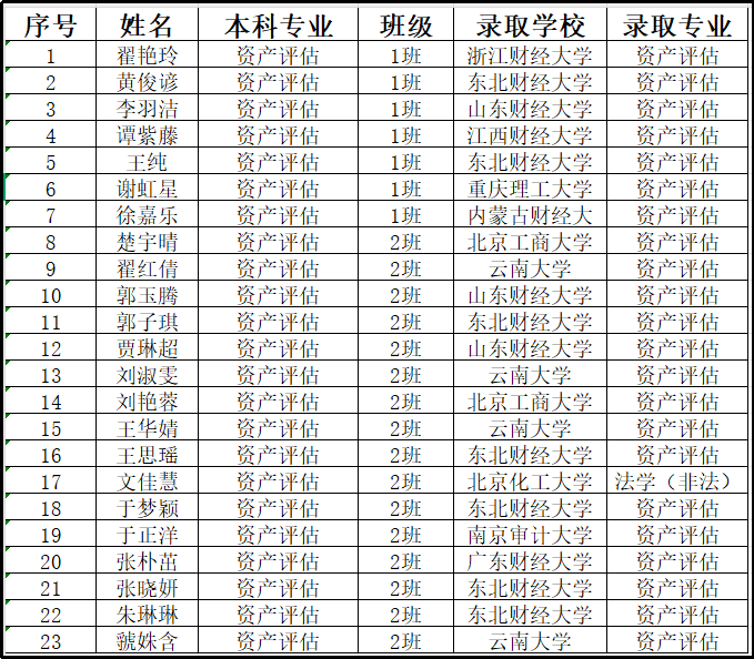 2026年全国硕士研究生招生录取工作已基本结束,山东管理学院会计学院资产评估专业2022级毕业生考研再传喜讯!本届共89名毕业生,23名同学成功上岸,被东北财经大学、云南大学、北京工商大学、南京审计大学、广东财经大学、浙江财经大学、山东财经大学、江西财经大学、重庆理工大学、内蒙古财经大学、北京化工大学等知名高校录取,录取率达25.84%,成绩喜人!