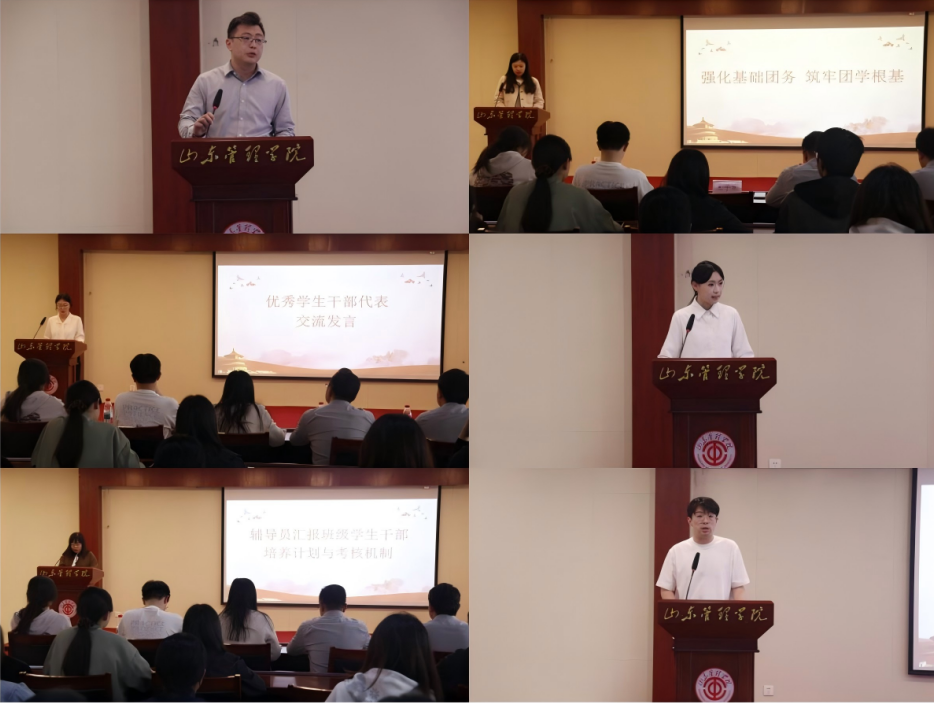 随后几项培训议程中,李彬彬老师针对学生日常管理、学院规章制度、团学班级事务及工作规范提出具体要求;王子寒老师针对基础团务、“三会一课”等做团务培训;优秀学生干部代表许董紫莹、闫泓霖做学生干部经验分享;新生辅导员范晓雅、聂昊分别就所带学生干部的培养计划、考核机制及预期阶段性成效进行了汇报。