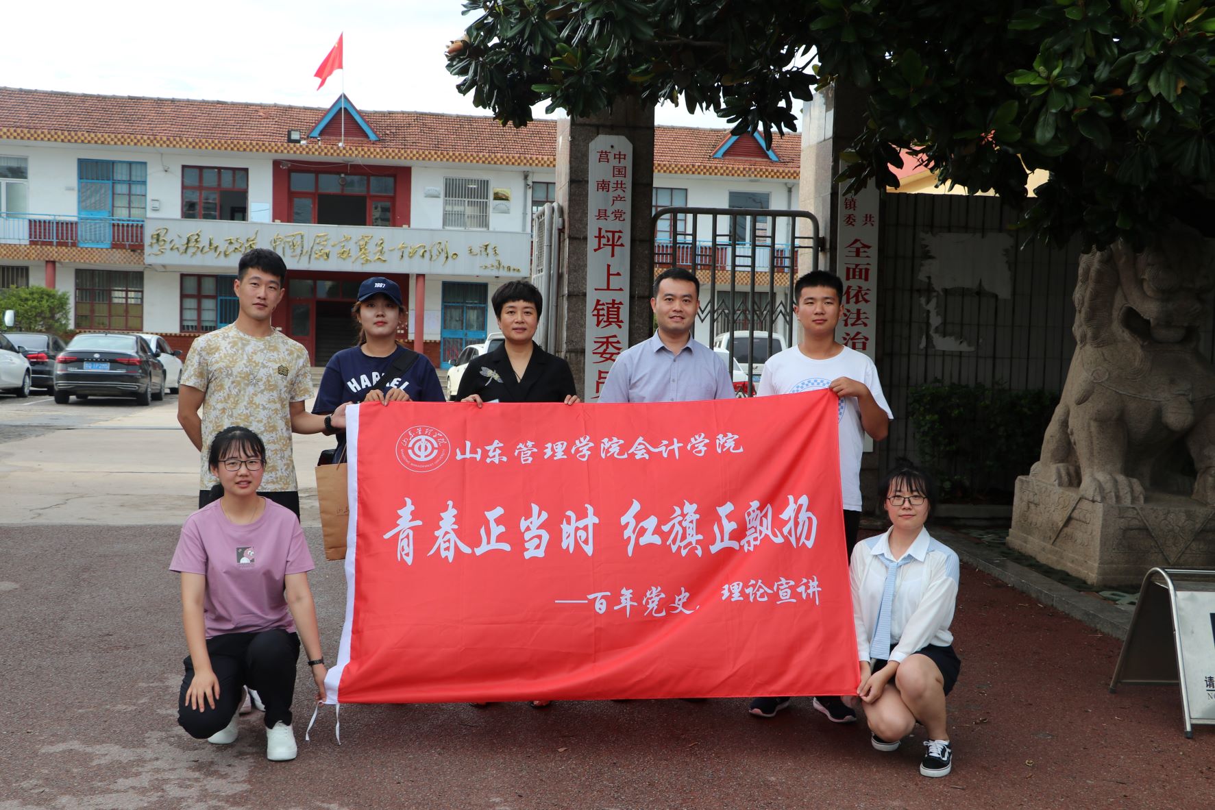 图为山东管理学院青春红旗宣讲队到达坪上镇政府所在地,镇党委书记在门口迎接,全体人员合影留念。 中国青年网 通讯员 许泽豪 供图