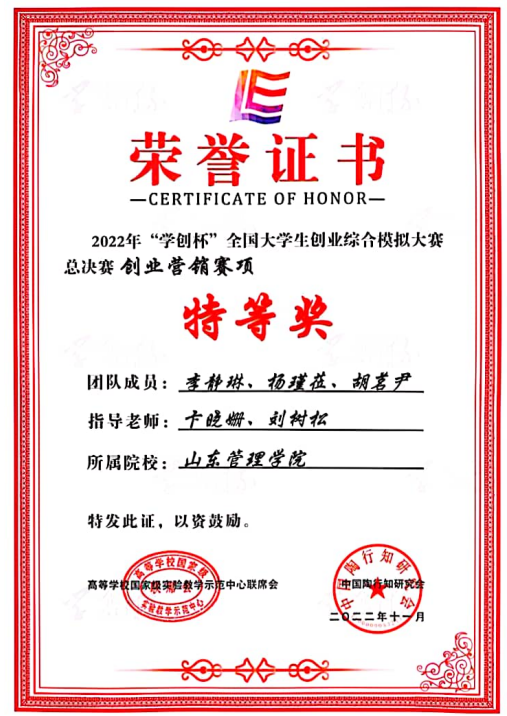2022年“学创杯”全国大学生创业综合模拟大赛获奖证书
