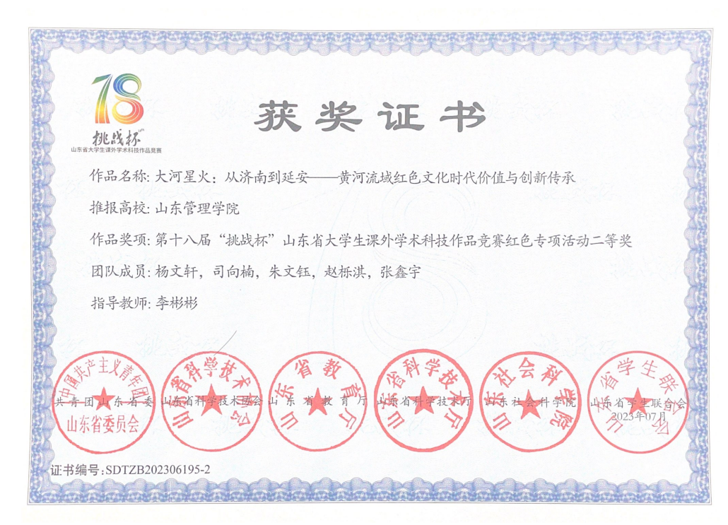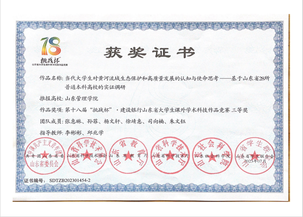 第十八届“挑战杯”·建设银行山东省大学生课外学术 科技作品竞赛获奖证书