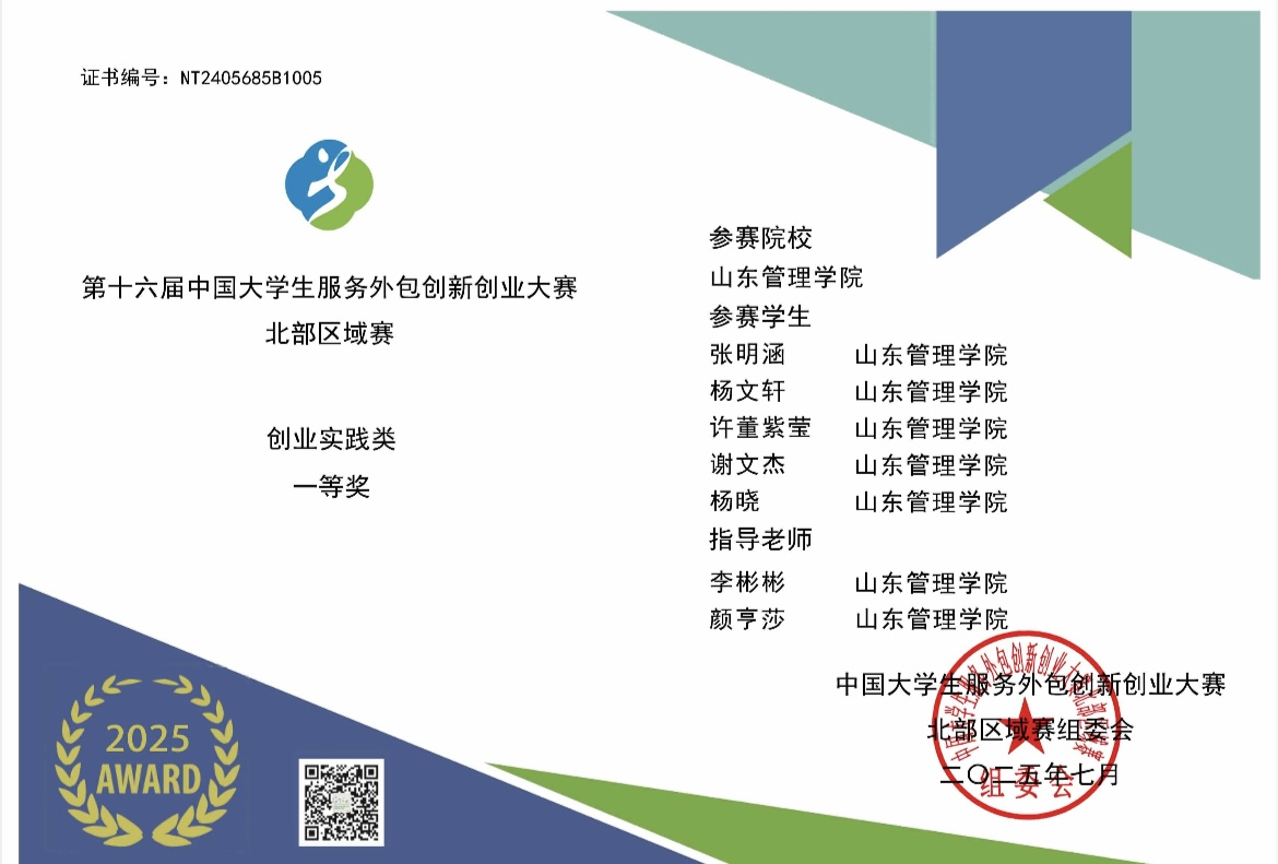 第十六届中国大学生服务外包创新创业大赛北部区域一等奖
