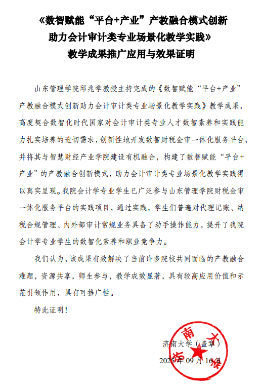 济南大学教学成果推广应用证明