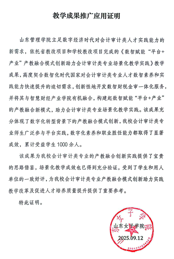 山东女子学院教学成果推广应用证明