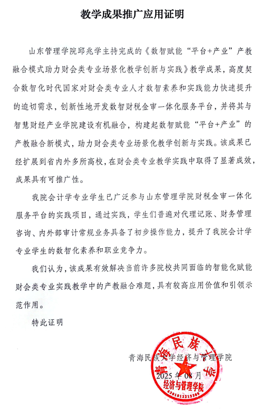 青海民族大学教学成果推广应用证明